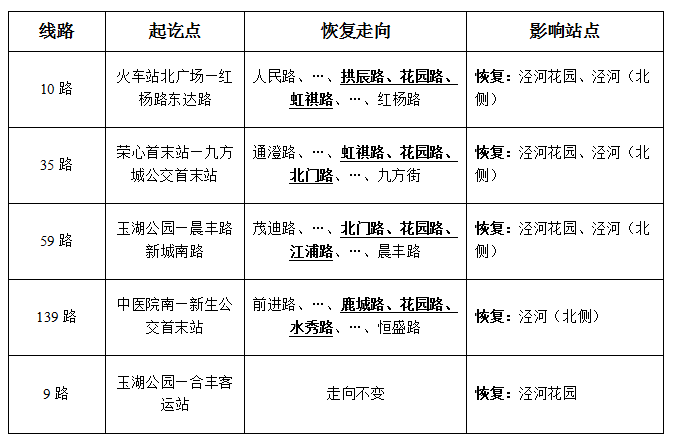 注:因“泾河(南侧)”、“花园路虹桥路”施工未恢复,公交10路、35路、59路、139路暂不恢复站点。