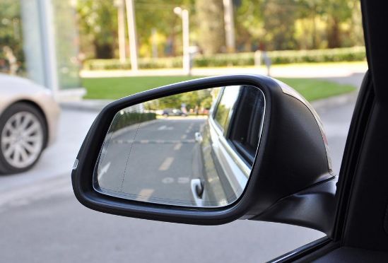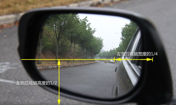 对于左侧外后视镜,我们要把后视镜里面的地平线映像调节至镜子中央,把左侧车身的映像调节至占据镜子右侧1/4的区域。