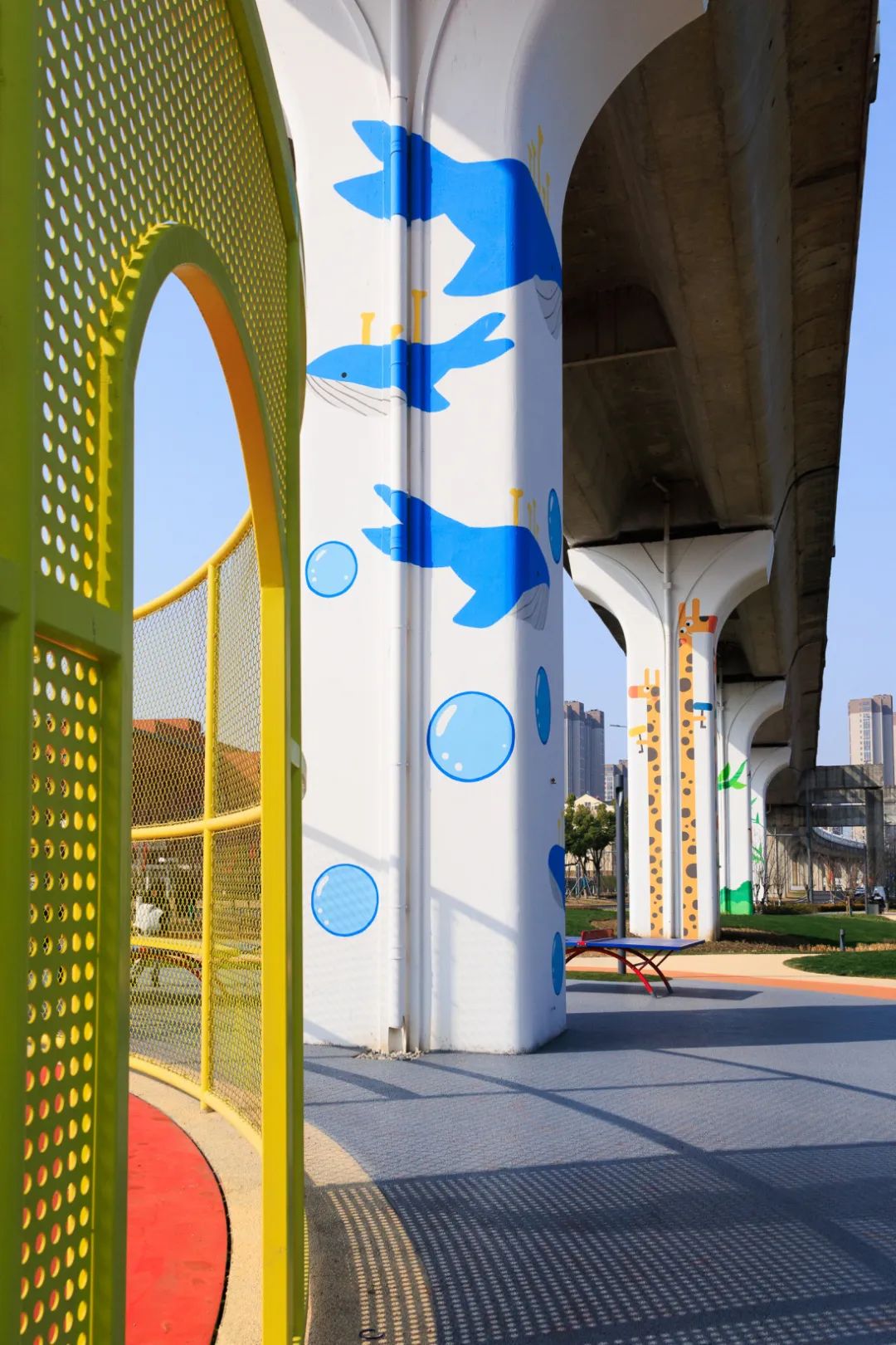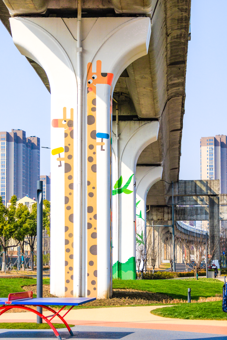 为了改变轨交11号线桥下水泥立柱单调无趣的形象,把长颈鹿、鲸鱼、猎豹、火烈鸟等动物卡通形象涂刷于立柱上,给原本冷冰冰的立柱增添了自然野趣。立柱上的图案和色彩与乐园的整体风格相呼应,增加了整个乐园的艺术氛围。