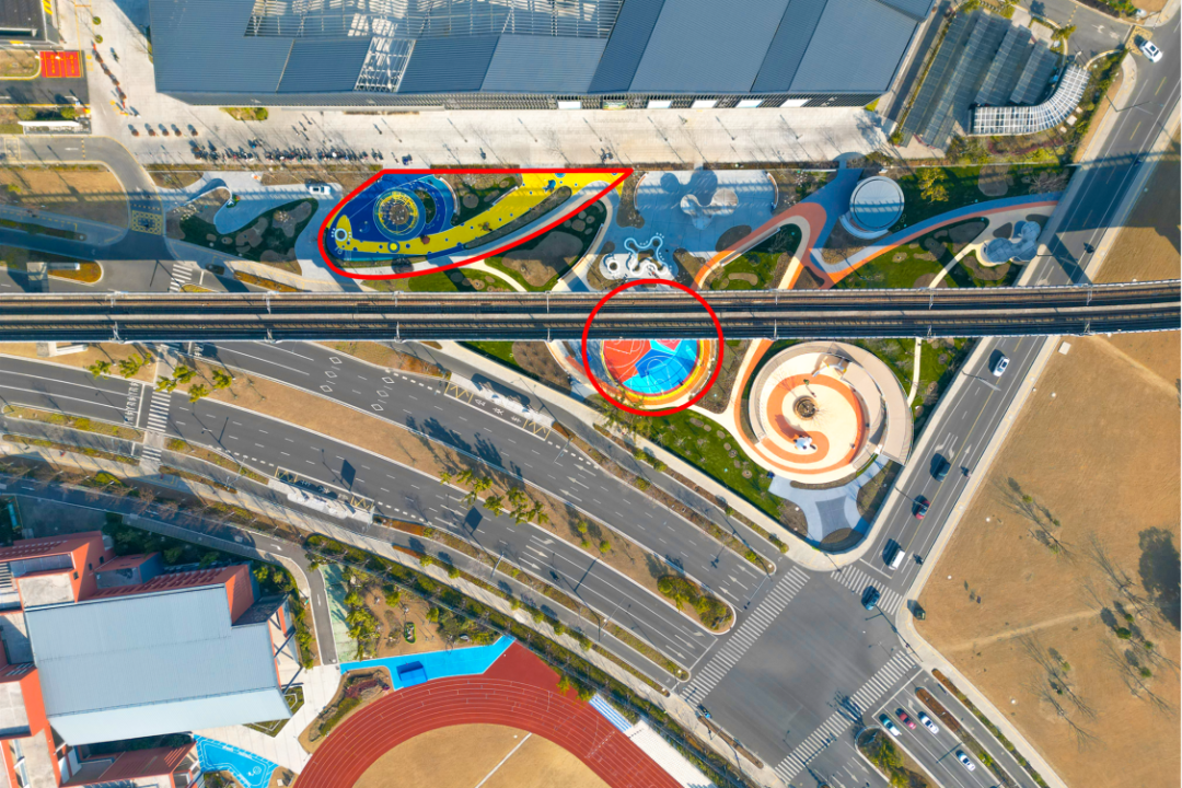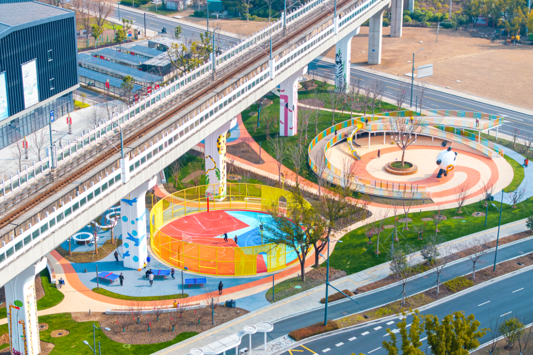 缤纷运动乐园建设时以“激活轨交11号线桥下空间”为出发点,通过场地丰富的竖向变化,设置了环形步道、森林乐园、缤纷游乐场、活力篮球场等极具童趣色彩的功能设施,同时对厚重的轨交立柱进行艺术喷绘,从而变身为儿童活动空间,成为小朋友们嬉戏玩耍的游乐园;变身为缤纷运动空间,成为市民们强身健体的运动场;变身为色彩丰富的林下空间,成为市民们乘荫纳凉的好地方。