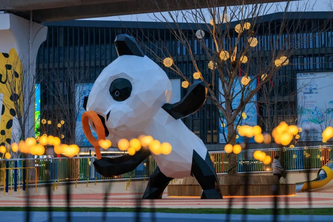 为了充分利用有限的空间,通过丰富的竖向变化,将不同功能的设施布置在不同的高度上。入口处的彩虹渐变色环形廊桥引人入胜,结合立体熊猫雕塑,共同组成了“熊熊打卡点”,游人可以选择在地面上与熊猫打卡合影,也可以选择沿着环形步道而上,从高处俯瞰公园,丰富的高度变化使得整个乐园呈现出层次感和趣味性。
