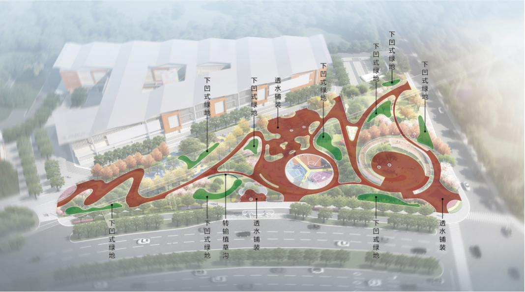 公园积极践行海绵城市建设理念,设置了透水铺装、下凹式绿地、转输植草沟3种类型的海绵设施,年径流总量控制率目标取值85%,设计降雨量34.0毫米,综合径流系数目标取值0.45,面源污染削减率目标取值为70%。