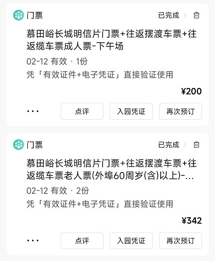 长城的话,去了慕田峪长城,老大当年去了八达岭长城,这次带老二去了慕田峪长城。儿童不要飘,大人全套200元,60岁以上老人全套171元,2人342元