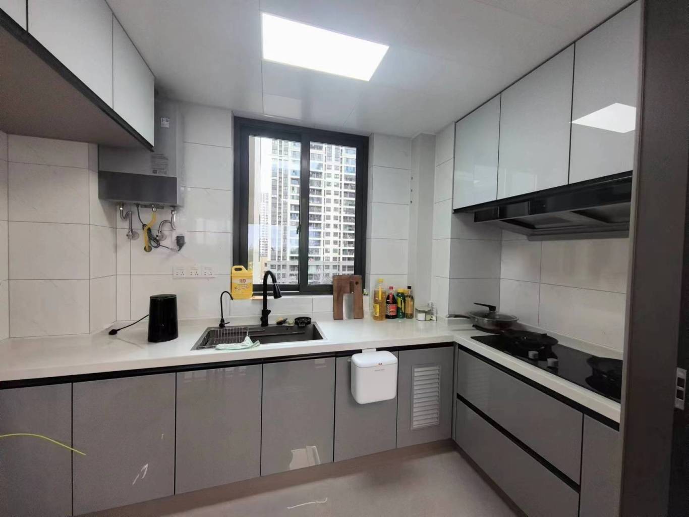厨房也是灰白搭配,和家里的整体风格一致。上下都是橱柜,收纳能力也是非常高。并且,插座数量也很多,能满足家里日益增多的厨房电器哦~