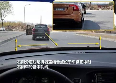 第一种方法,就是看当右侧车道白线与机盖中央位置重合时你的车就基本压线了。