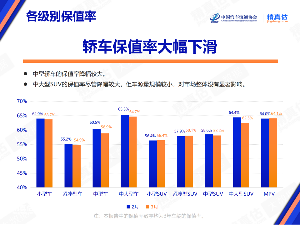 细分来看,3月各级别保值率大多出现不同程度的下滑,下滑比较明显的是中大型SUV和中型轿车,3年车龄的保值率分别环比2月下滑1.9%和1.6%。虽然中大型SUV保值率下滑幅度颇大,但该车细分市场规模较小,对市场整体影响不大。3月紧凑型SUV和MPV保值率均有所上涨,分别微增0.2%和0.1%。从各级别车型的保值率总体表现来看,SUV因具备更强的功能性,保值率降幅较小,轿车类3月保值率大幅下滑。
