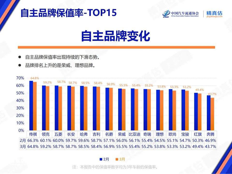 再来看看自主品牌,3月自主品牌三年保值率继续出现集体下滑态势,但传祺、长安、吉利等车企凭借知名度和产品力,在价格战大背景下仍维持较高的保值率。