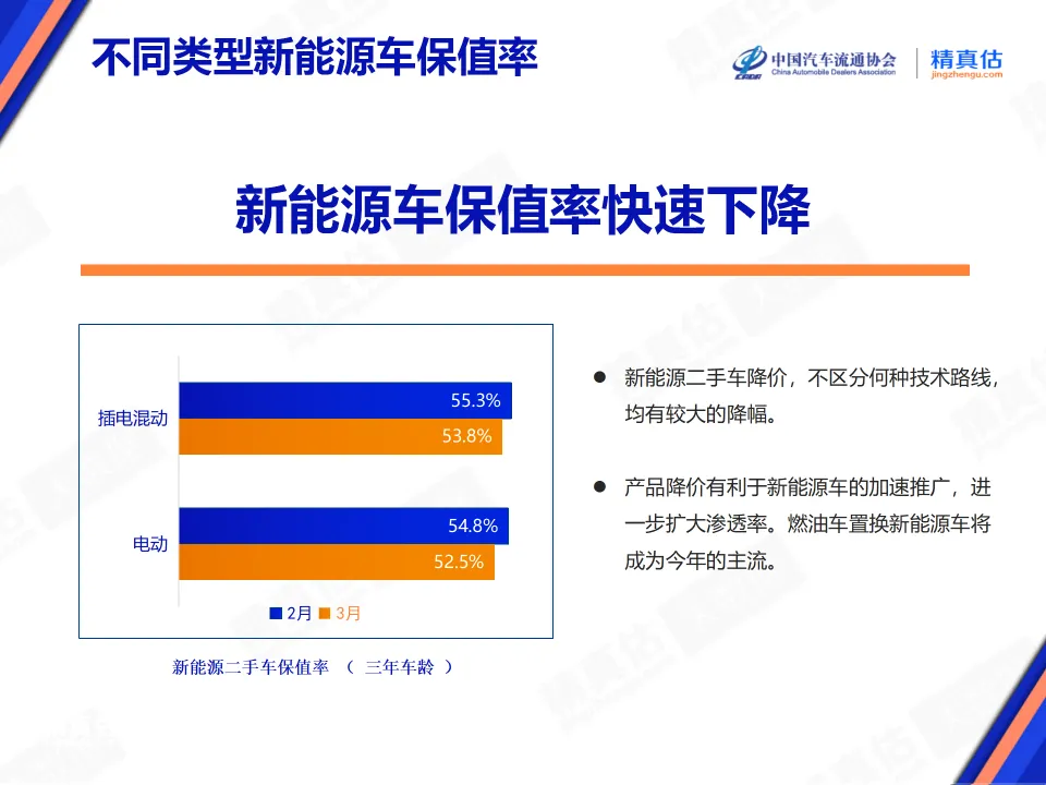 最后再来看看新能源车领域,虽然国内新能源车整体渗透率正逐步提升,但由于动力电池成本的下降以及新车价格战的打击,导致新能源二手车出现暂时滞销现象。按动力类型来划分,插电混动车型三年车型保值率为53.8%,环比2月的55.3%下滑1.5%;纯电动车型的保值率为52.5%,环比2月的54.8%下滑2.3%。