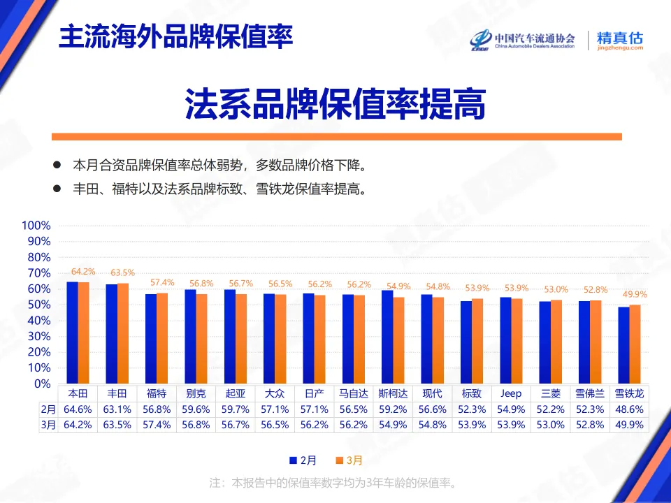 报告指出,本月合资品牌保值率整体呈现弱势,多数品牌价格下降,原因是国内车市整体降价,导致车源份额较大的合资品牌承受贬值的压力,保值率由此也出现下滑趋势。值得一提的是,3月美系车保值率超过大众,法系标致、雪铁龙品牌均有小幅回升,其中,标致三年保值率由2月的52.3%涨至53.9%;雪铁龙由48.6%涨至49.9%。