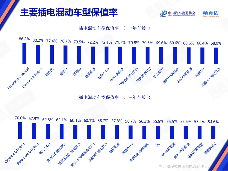 纯电动车榜单中,纯电车型一年保值率前三名分别为保时捷Taycan、ZEEKR 009、特斯拉Model 3;在插电混动榜单中,比亚迪多款插电混动车型位列榜单top15中,插电混动车型一年保值率前三名分别为Panamera E-Hybrid、Cayenne E-Hybrid、腾势D9,理想L9和理想L8也分别进入榜单前五名中。
