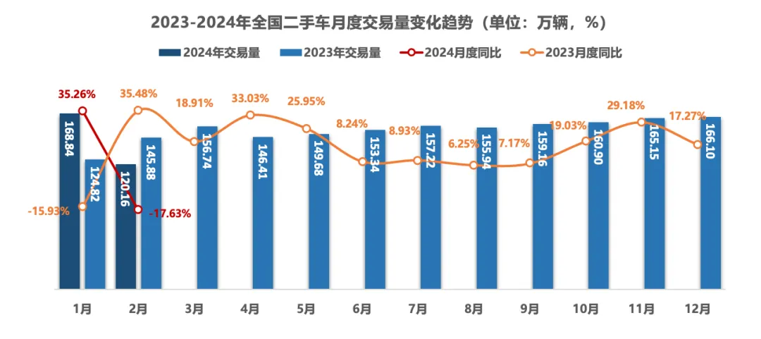 中国汽车流通协会数据显示,2024年1-2月,全国二手车累计交易量为289万辆,同比增长6.76%,与同期相比增加了18.3万辆,累计交易金额为1959.25亿元。值得一提的是,以往二手车贬值的原因大多是因为技术迭代太快,但目前更多是受价格战以及政策利好影响,此前多家车企均推出“以旧换新”的置换补贴政策,以此刺激消费者购车,但这一动作也进一步挤压了二手车价格,对二手车经营者造成一定的压力。