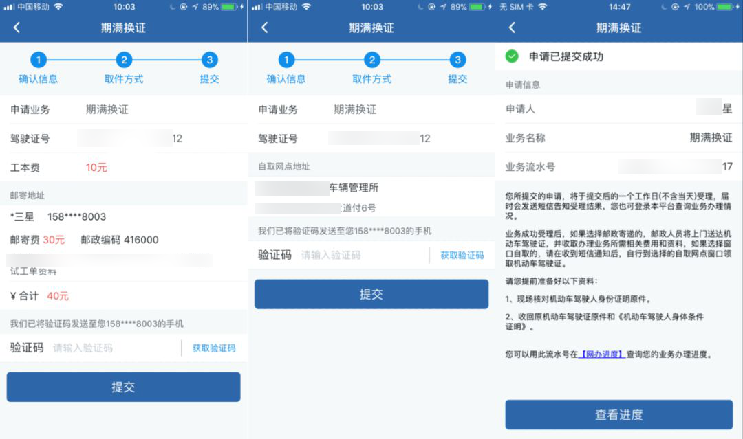 取件方式确认后,点击【下一步】,进入期满换证提交页面,再次确认所填资料信息无误后,点击【获取验证码】获取手机短信验证码,核验通过后,点击【提交】,完成期满换证业务申请信息提交。