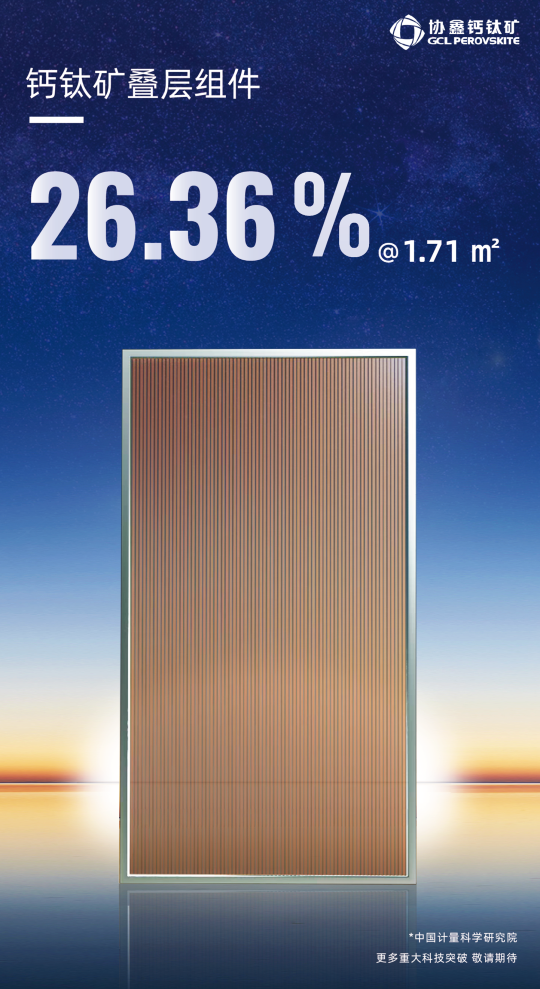 数据最有说服力。2023年,协鑫光电连续打破三项世界纪录,取得了钙钛矿单结组件18.04%(2m2),叠层组件26.17%(1032cm2)、26.34%(2048cm2)的佳绩;现在,协鑫光电叠层组件“效率、尺寸”再一次双双打破世界纪录,实现1.71㎡、稳态效率26.36%,这些为最终突破26%(2.88m2)这一钙钛矿组件商用临界点,打下坚实基础。