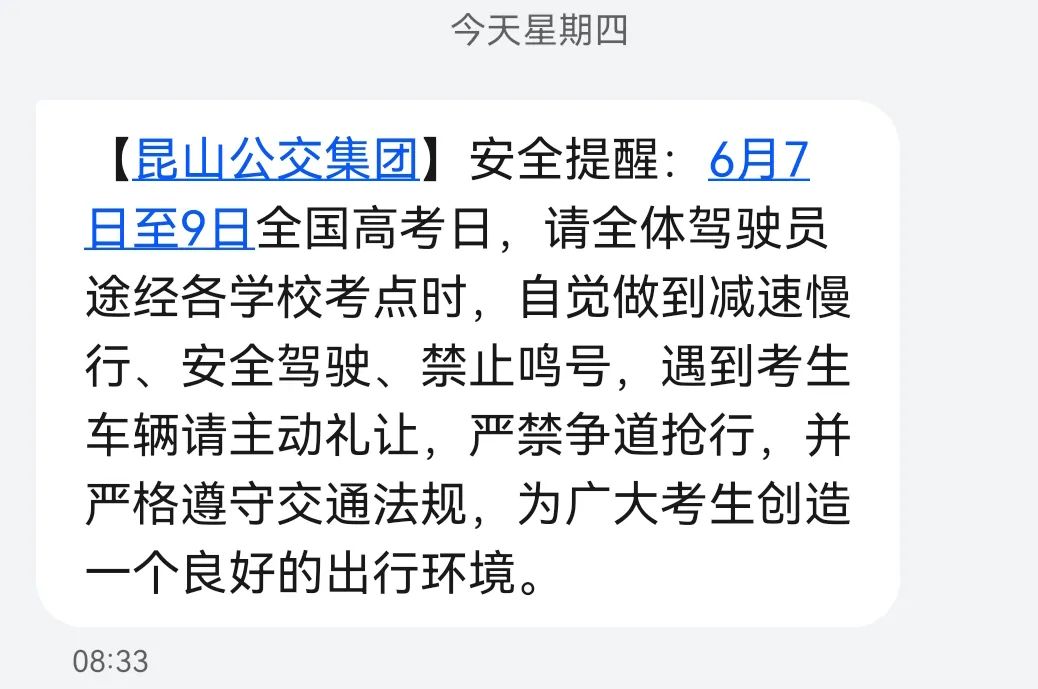 为给广大考生提供一个良好的出行环境,昆山公交给营运驾驶员发送提醒短信。