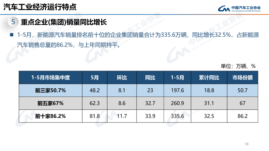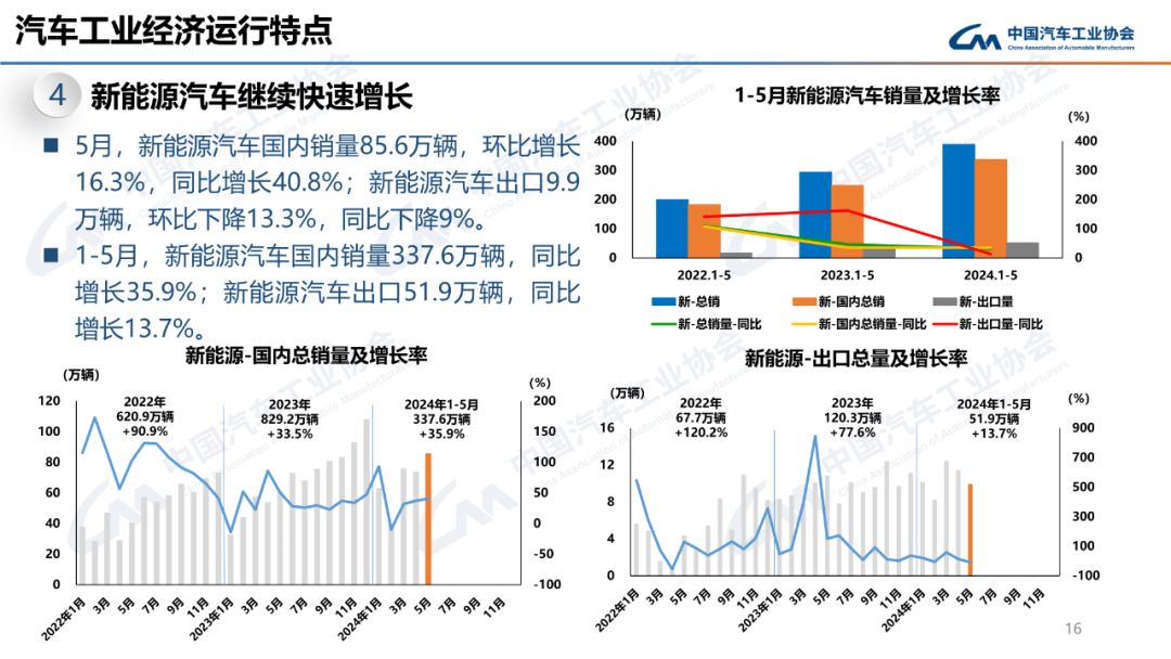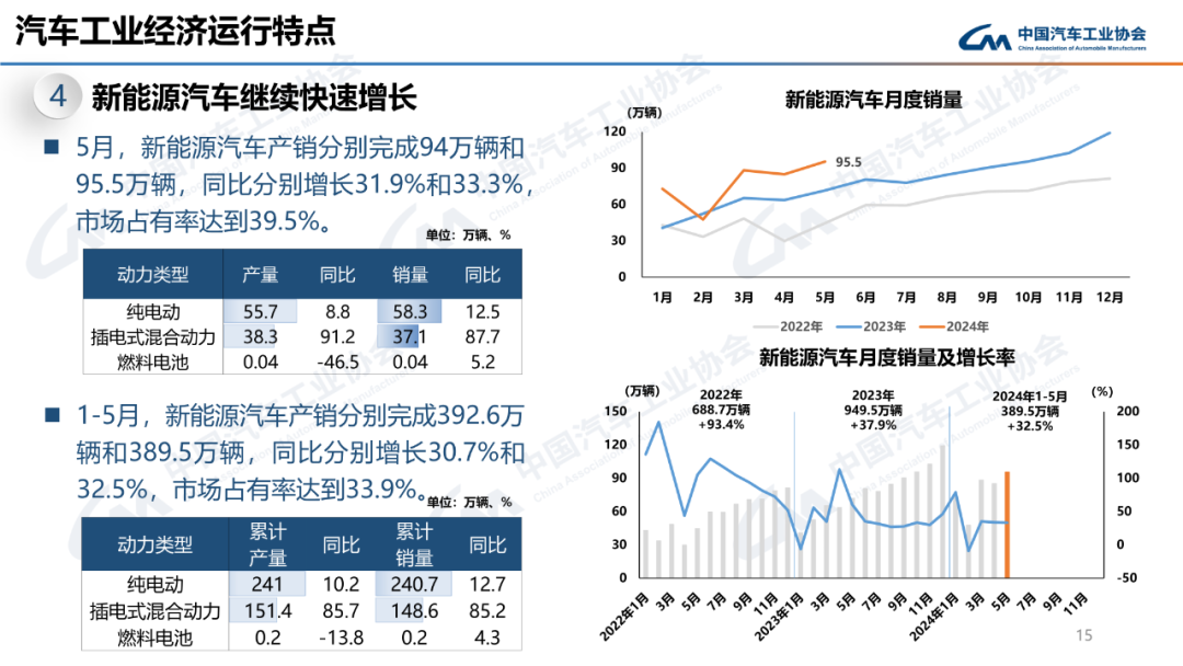 5月,新能源汽车产销分别完成94万辆和95.5万辆,同比分别增长31.9%和33.3%,市场占有率达到39.5%。1-5月,新能源汽车产销分别完成392.6万辆和389.5万辆,同比分别增长30.7%和32.5%,市场占有率达到33.9%。
