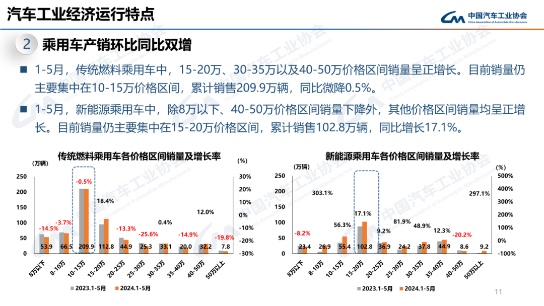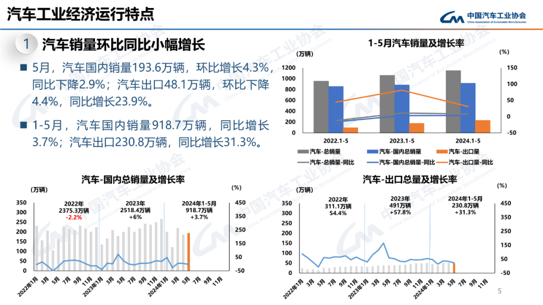 5月,汽车产销分别完成237.2万辆和241.7万辆,产量环比下降1.4%,销量环比增长2.5%,同比分别增长1.7%和1.5%。1-5月,汽车产销分别完成1138.4万辆和1149.6万辆,同比分别增长6.5%和8.3%,产销增速较1-4月分别收窄1.3个和2个百分点。