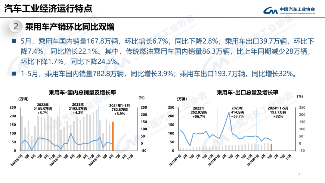 5月,乘用车产销分别完成205.1万辆和207.5万辆,环比分别增长0.1%和3.7%,同比分别增长2%和1.2%。1-5月,乘用车产销分别完成970.9万辆和976.5万辆,同比分别增长7.1%和8.5%。