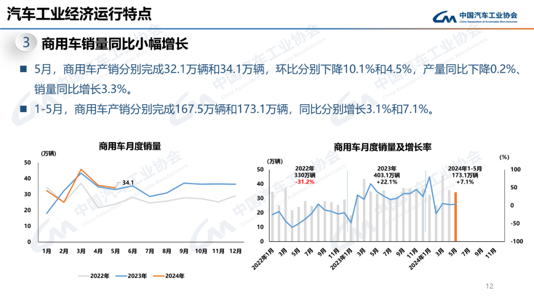 5月,商用车产销分别完成32.1万辆和34.1万辆,环比分别下降10.1%和4.5%,产量同比下降0.2%、销量同比增长3.3%。1-5月,商用车产销分别完成167.5万辆和173.1万辆,同比分别增长3.1%和7.1%。