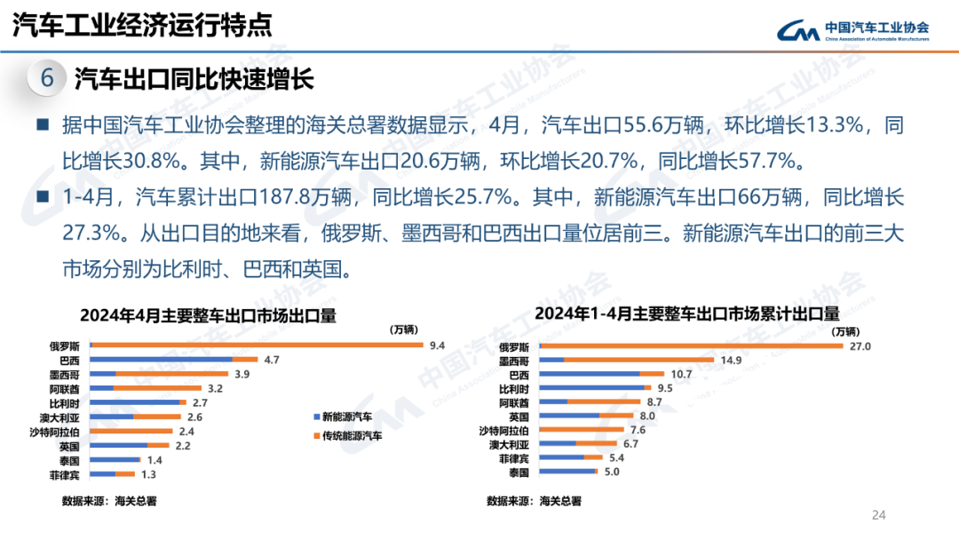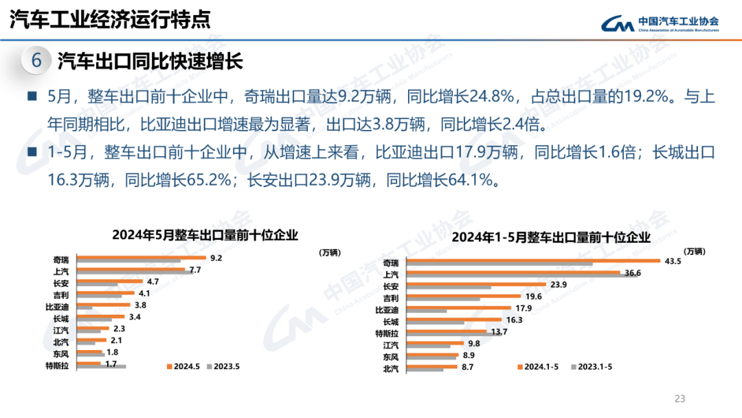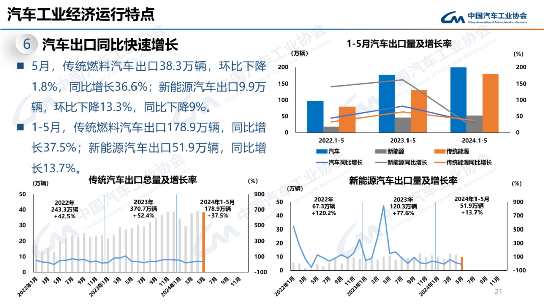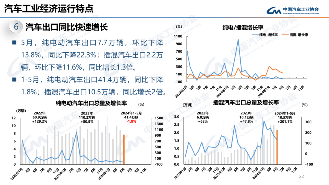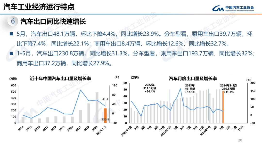5月,汽车出口48.1万辆,环比下降4.4%,同比增长23.9%。1-5月,汽车出口230.8万辆,同比增长31.3%。