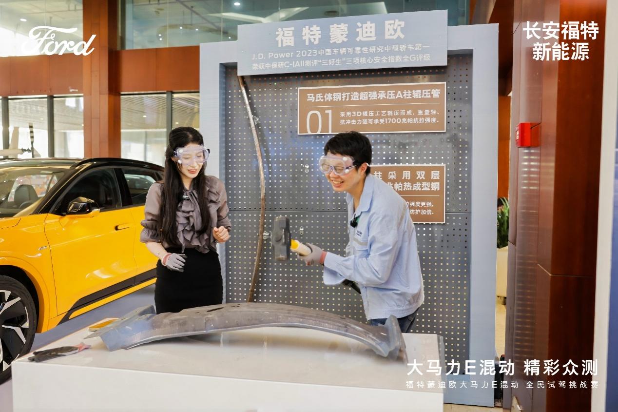 除了常规的性能油耗测试,体验区还设置了“千锤百炼”环节,众来宾抡起大锤、电钻,对蒙迪欧运动版高强度车身零部件进行测试,铁锤声声、钻声轰轰,却未能撼动车身零部件分毫。蒙迪欧运动版采用高安全笼形车身,从A柱到C柱的延伸,采用业内领先的1700MPa超高强度3D辊压工艺马氏体钢,整车600MPa以上的高强度钢占比达到52%。零部件破坏性测试,让这些日常用车时无法清晰感知的优点“可视化”,安全品质看得见。