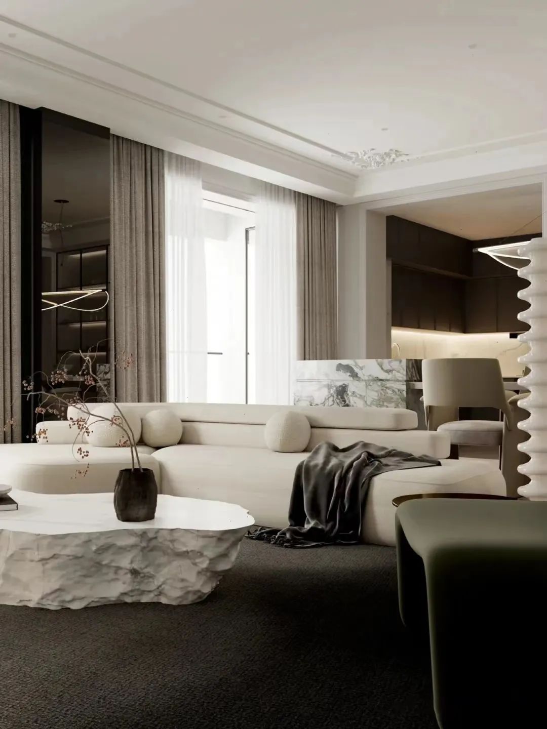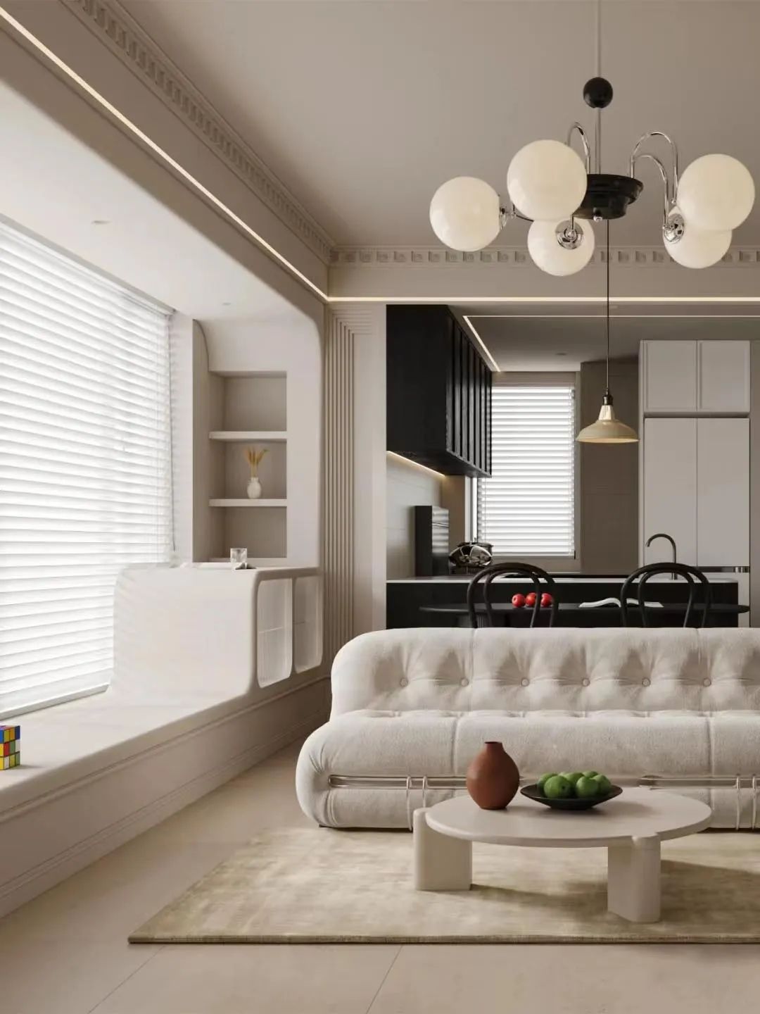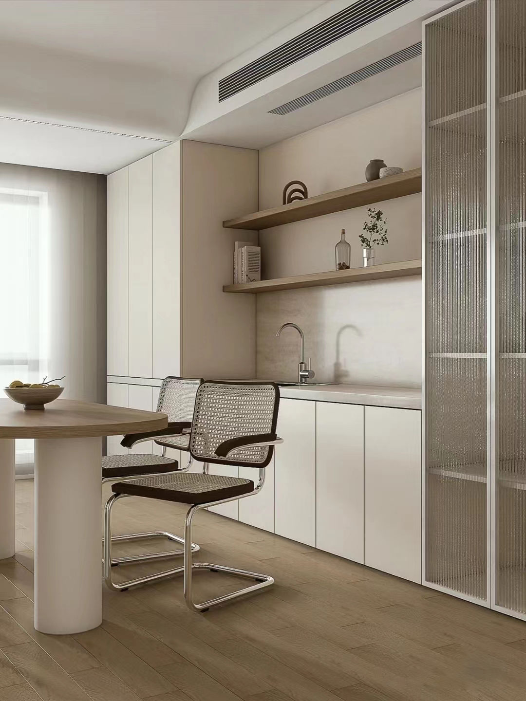 将两个空间合并为一个空间,减少实体墙面的阻隔,可以让空间更大。例如客餐厅一体设计,将空间打穿,大面积的开阔领域呈现在眼前,整体的公共区域看起来就更加宽敞大气。如果真的喜欢分隔空间的话,建议用玻璃隔断或者半开放式的柜体,既能收纳,又能划分功能区,一举两得。