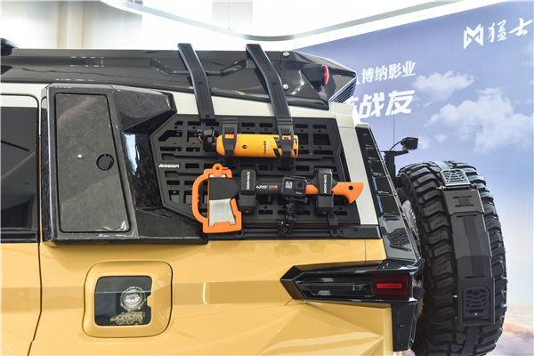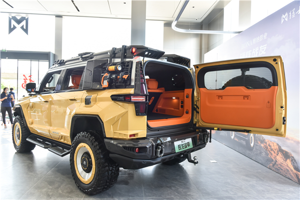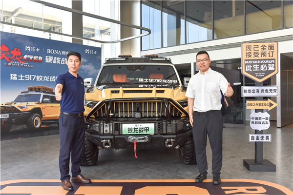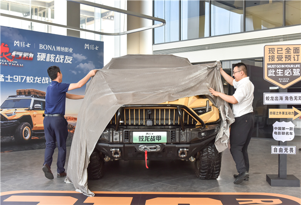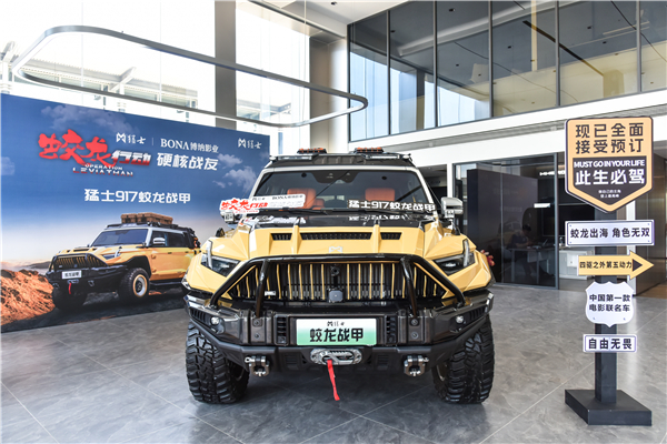 它是电影《蛟龙行动》联名的猛士917特别款车型——猛士蛟龙战甲。作为一款与电影联名的特别款车型,无论是外观还是内饰,从内而外从头至尾,自然都是满满的电影元素以及特装定制。
