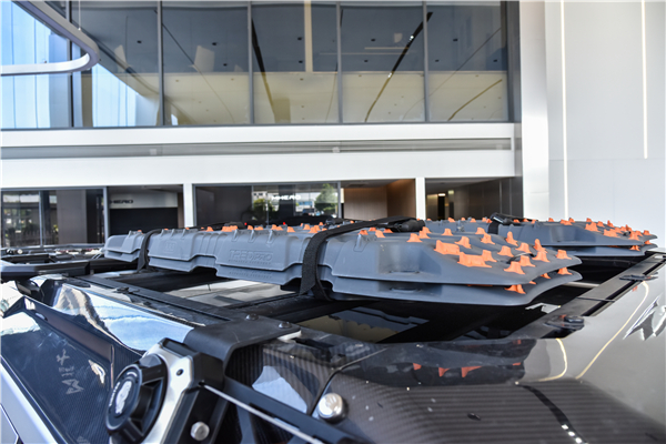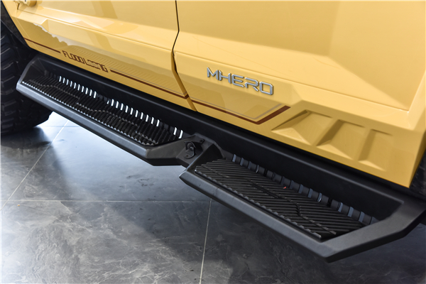 车身侧面,猛士蛟龙战甲具有浓厚的军车元素,包括全封闭式旋翼锻造轮辋、前后宽体轮眉、车顶平台防风罩、车身同色的车门防擦板等。同时,还配备碳纤维侧挂储物箱,容积达到40升,还可实现越野装备、救援用具净污分离。