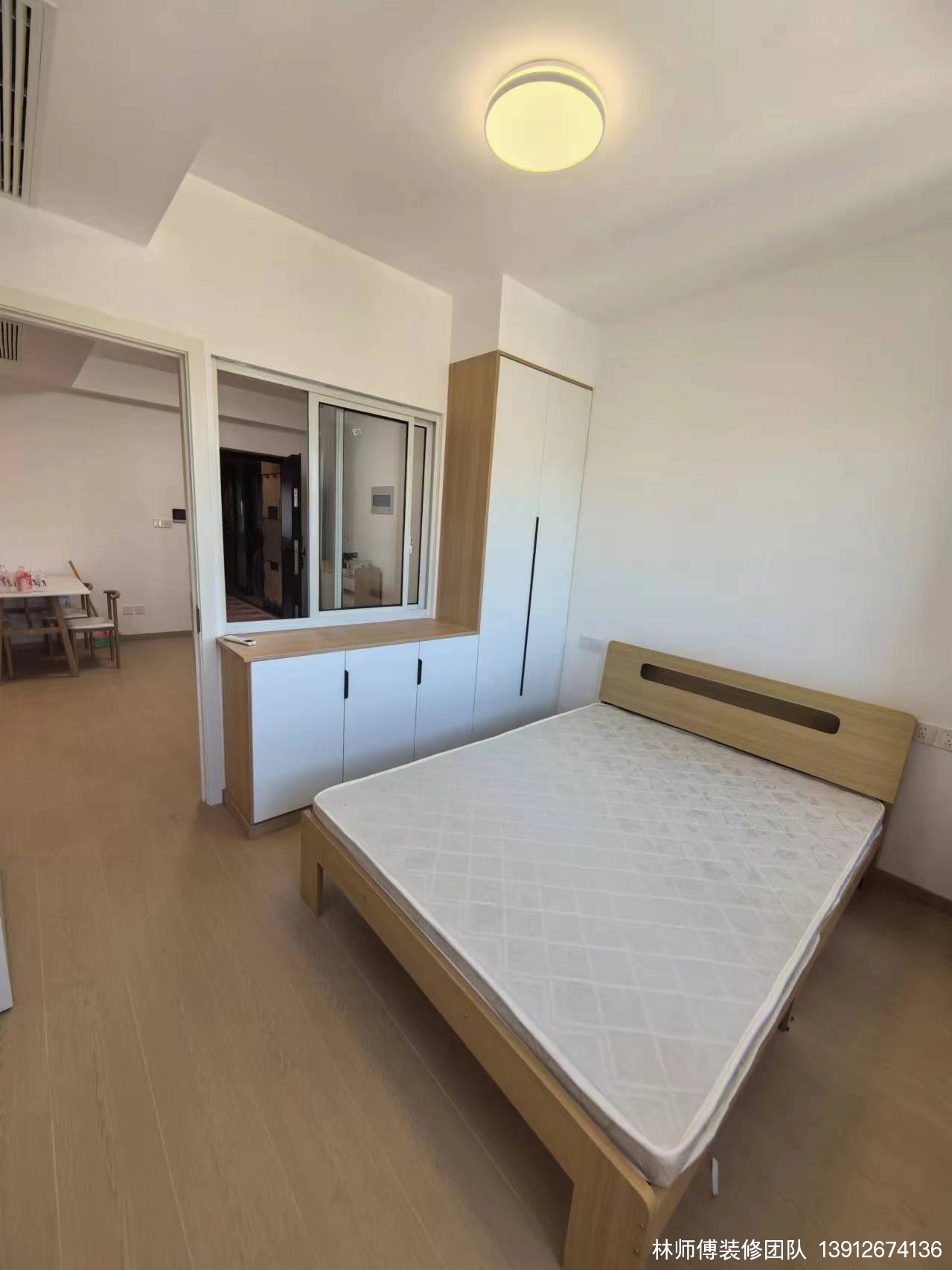 卧室一张床+衣柜足以,房间和客厅之间的墙上开了一扇窗,让光线可以通过,保证客厅的采光和通风。后期可以在这里加上窗帘,保证私密性。