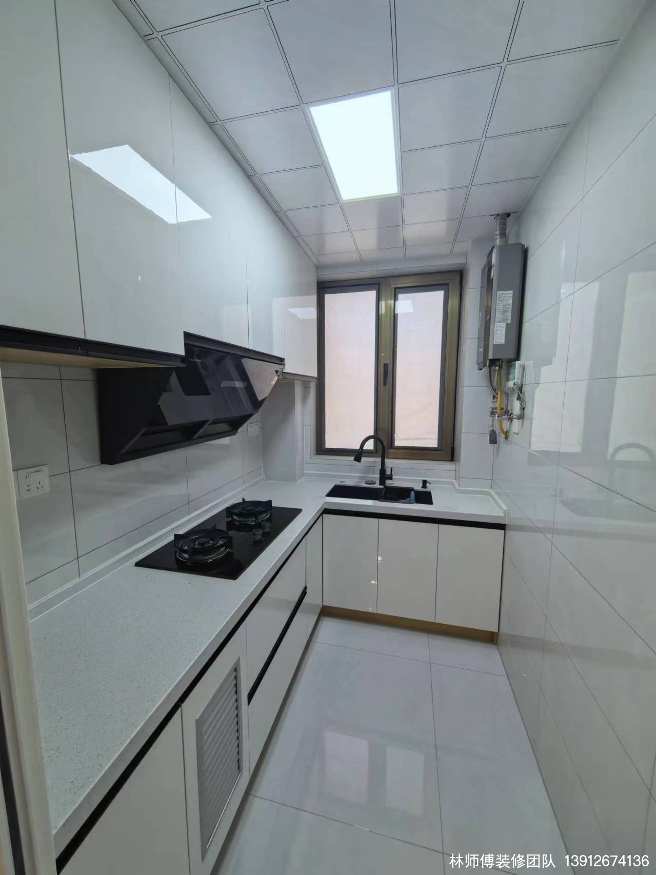 厨房都是用的白色,看上去非常干净清爽,L型设计,上下吊柜,收纳能力很充足。