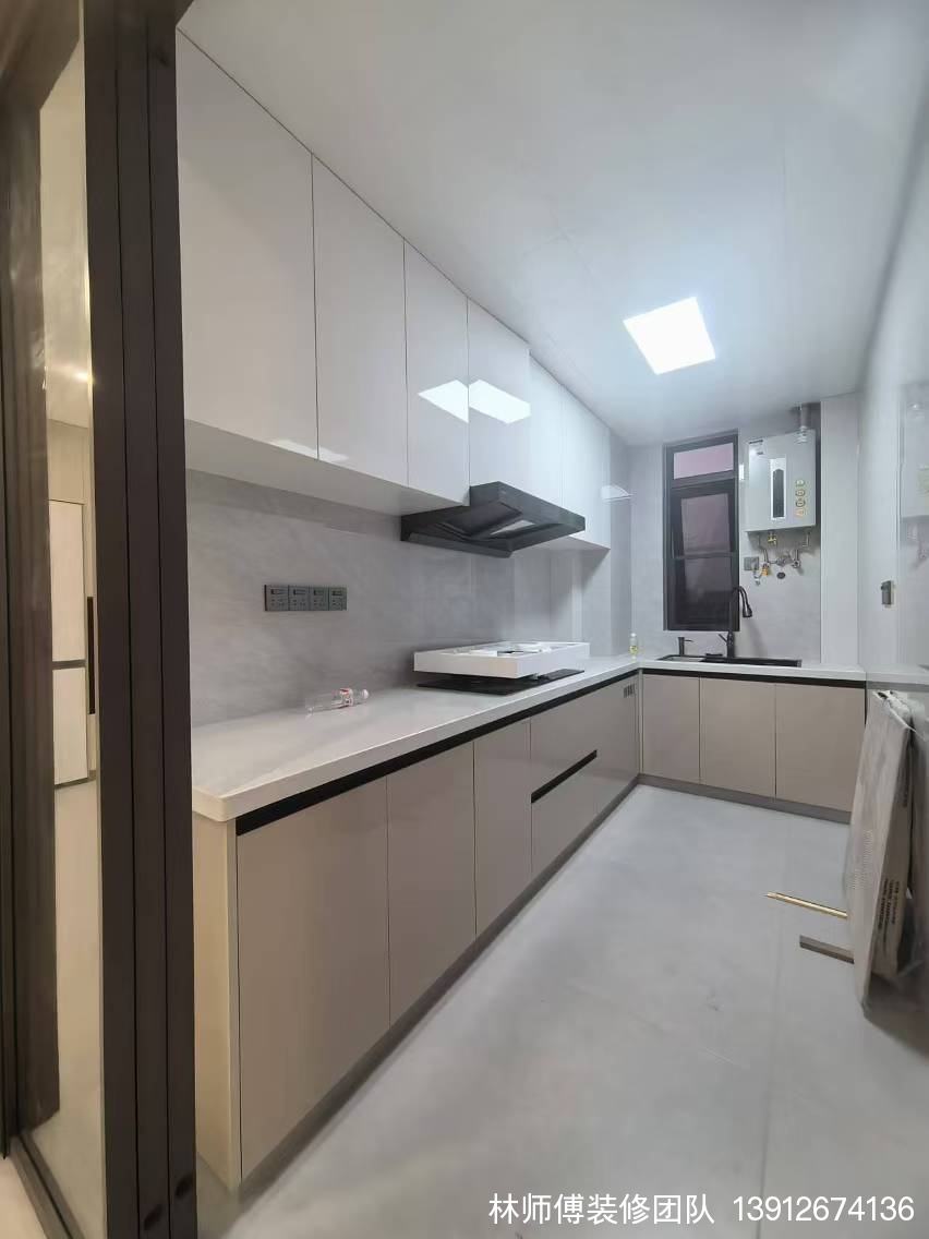 L型的厨房,储物空间更丰富。简洁流畅的橱柜线条,白色的吊柜和台面,搭配原木色的地柜,整个基调更加清爽整洁。