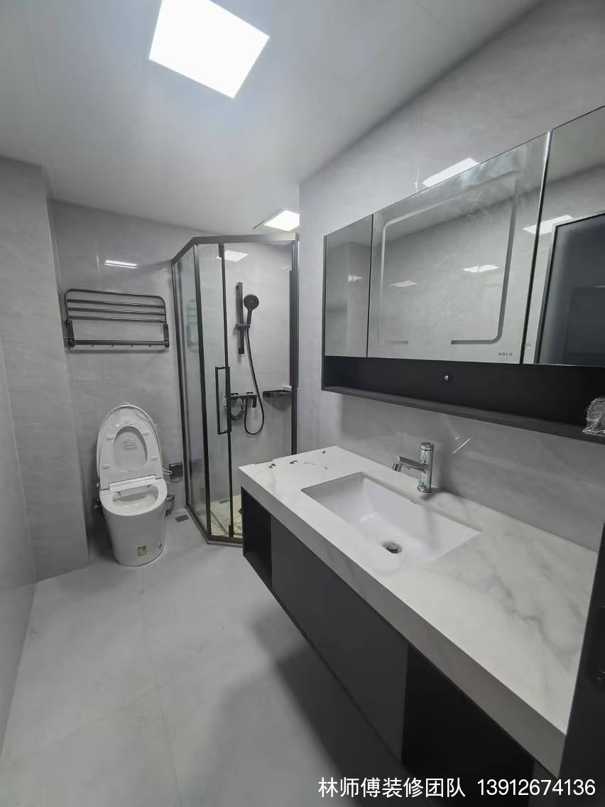 家里的两个卫生间都做了干湿分离,客卫在干湿分离的基础上,又将洗手池外移,独立出一个单独的洗手区,不仅大大提高了利用率,也营造出了更加舒适的卫浴环境。长方形的镜面柜,收纳充足,灯带设计,让空间瞬间清亮起来。
