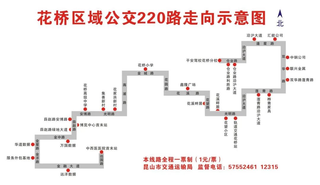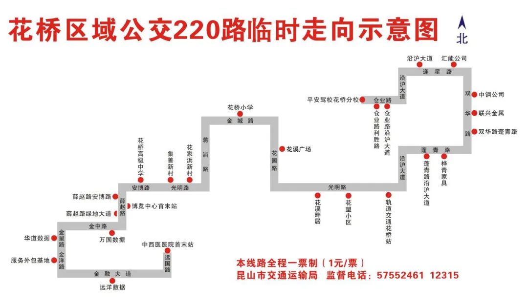 (3)花桥区域公交220路走向调整,取消:“花桥博览中心、绿地大道远政路、绿地大道集善路、集善路绿地大道、集善路金中路、金中路集善路”,同步增设:“薛赵路绿地大道(西侧)、华道数据、中西医医院首末站”。