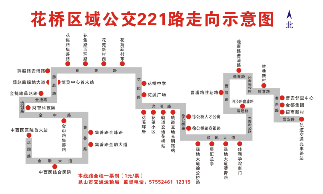 (1)花桥区域公交221路走向调整,取消:“服务外包基地、远洋数据”,同步增设:“中西医医院首末站”。