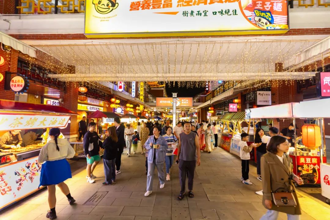 此外,园区内还设置了集美食、互动、娱乐、赏景等多元内容于一体的贞丰食肆,让游客们可以沉浸式体验“景中游,灯下购”的消费新场景。在美食摊位前,不少游客都选购了好几样小吃,津津有味地品尝起来。