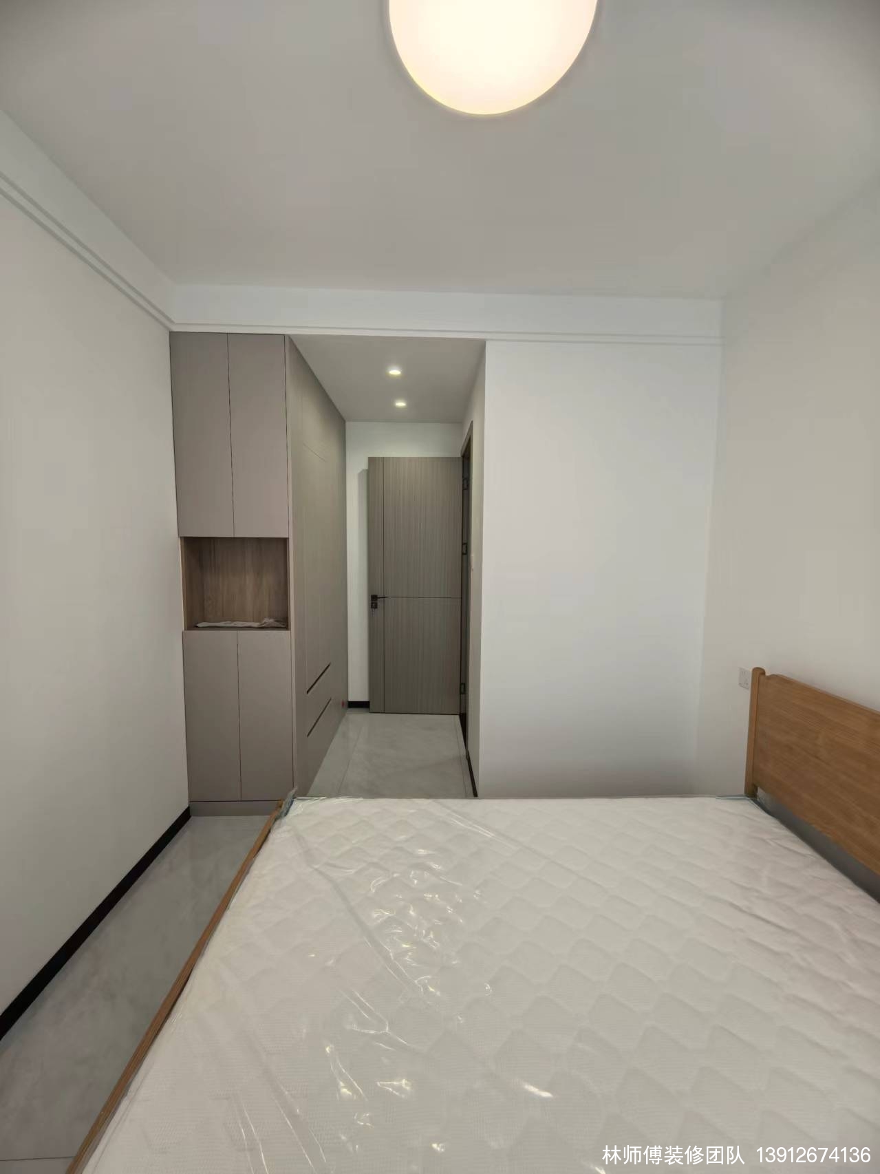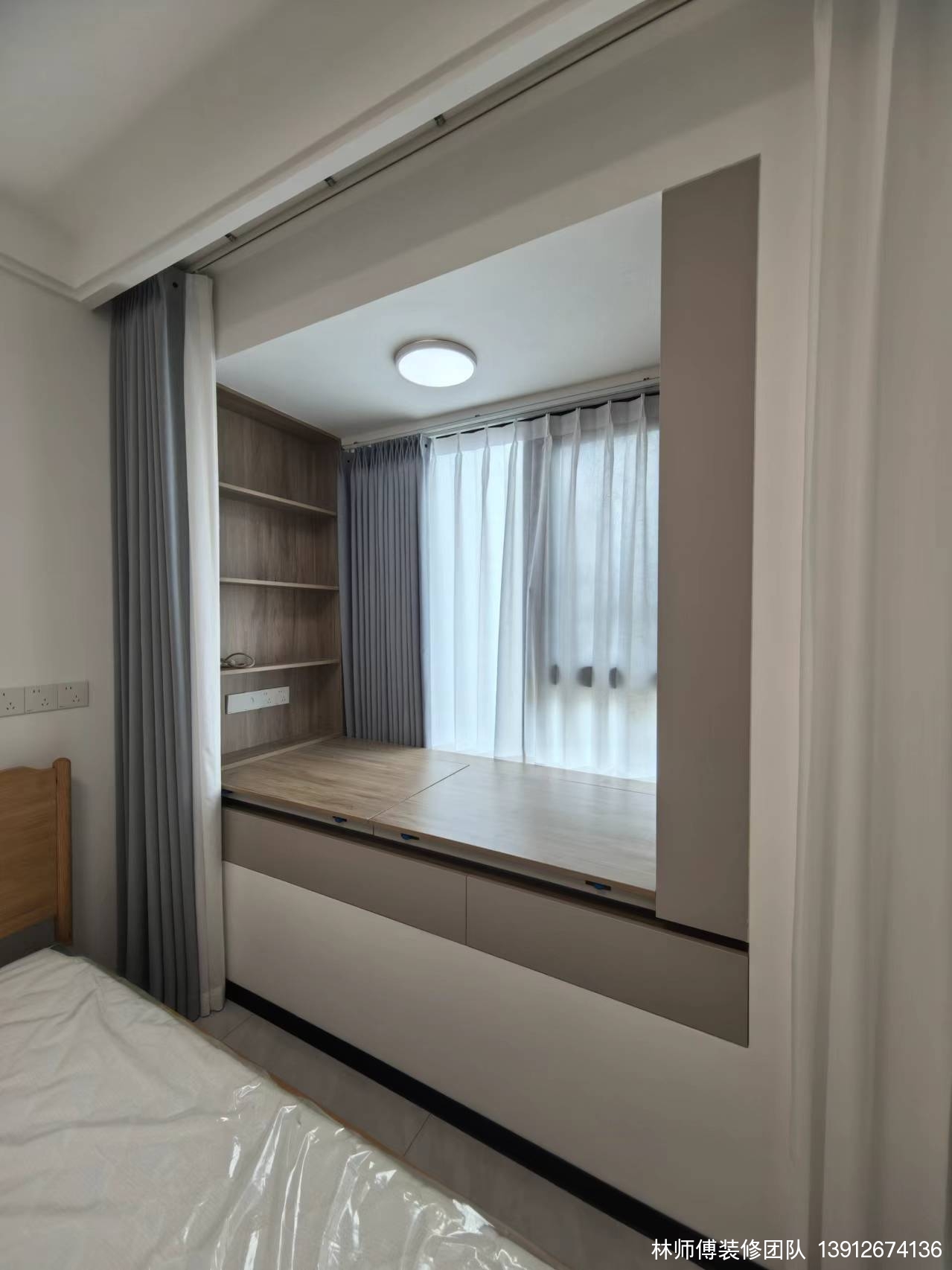 次卧的衣柜在进门处,飘窗设计成抽屉+柜子的组合,不仅增加了收纳空间,开放式的柜子还能放一些书或者饰品。