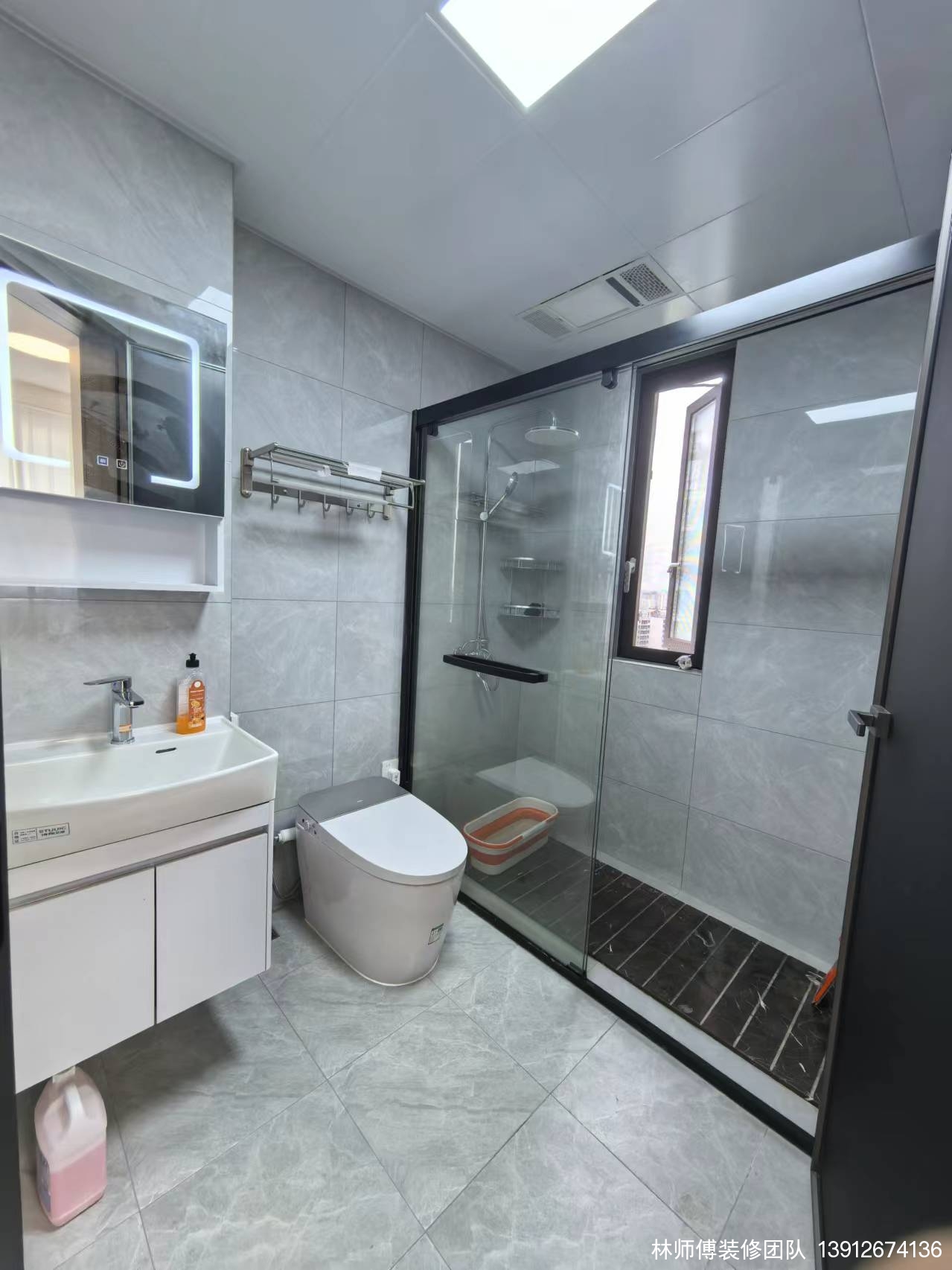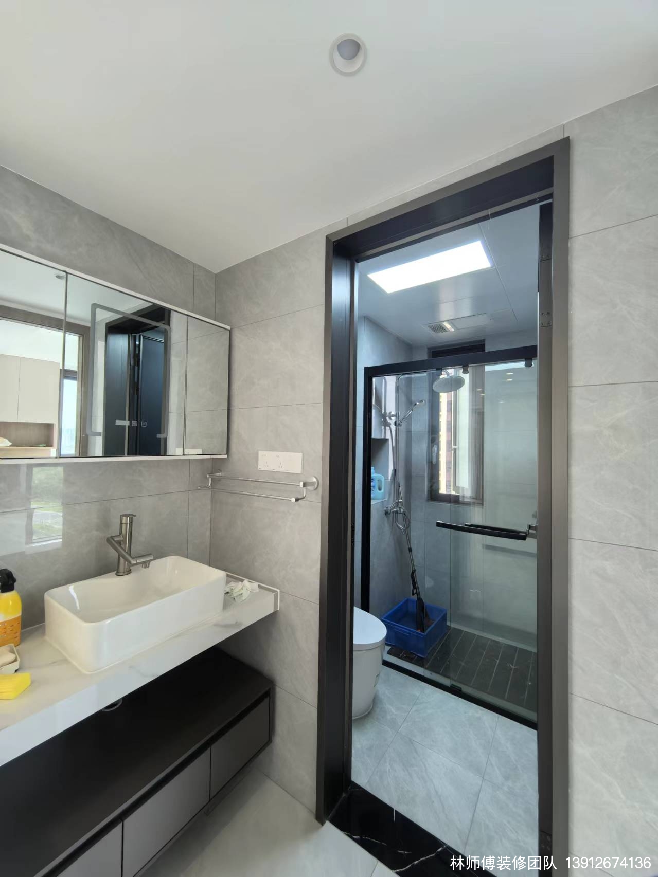 家里的两个洗手间都做了干湿分离。客卫更是做了三分离,洗手池外移,使用起来更加方便。镜面柜收纳能力超级高。灰黑色的搭配,也非常耐脏哦~