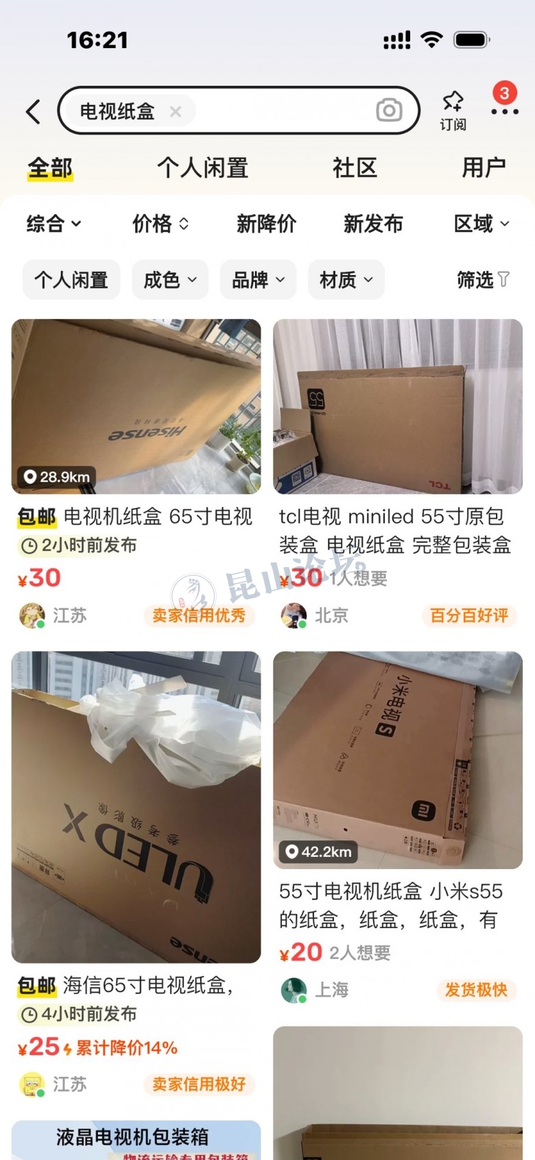 事情是这样的,邻居刚买的 85 寸大电视,盒子拆下来放在过道,结果没多久就被拿走了,我们都怀疑是保洁的当废品收走了,但是她说其他的乱七八糟纸盒子没拿,唯独就拿电视机纸盒子看来那人也是识货的。她说她本来准备挂咸鱼卖的!!一个起码能卖 50,咸鱼上一看还真是,后来又问了别的邻居,他说 100 寸的电视纸盒子能卖 200 快了,提醒大家,最近买电视的,千万别扔掉纸盒子!转手就赚个小家电!