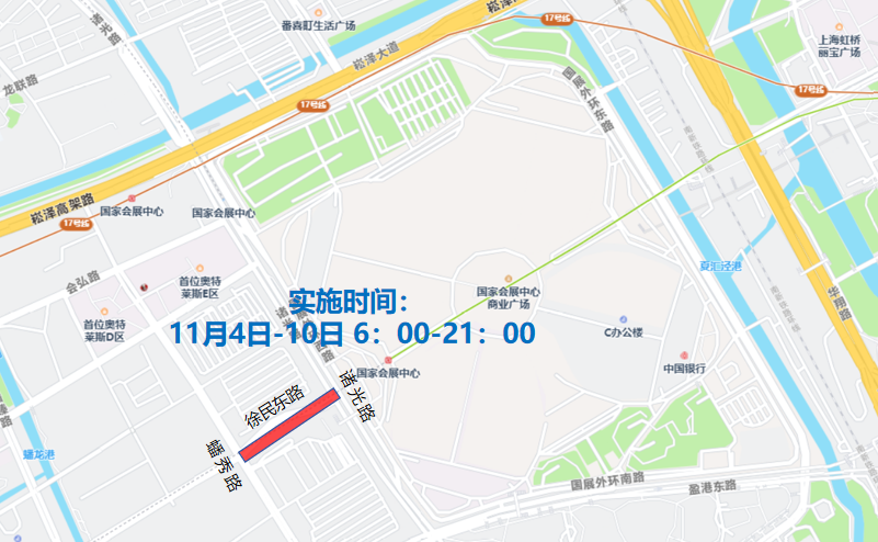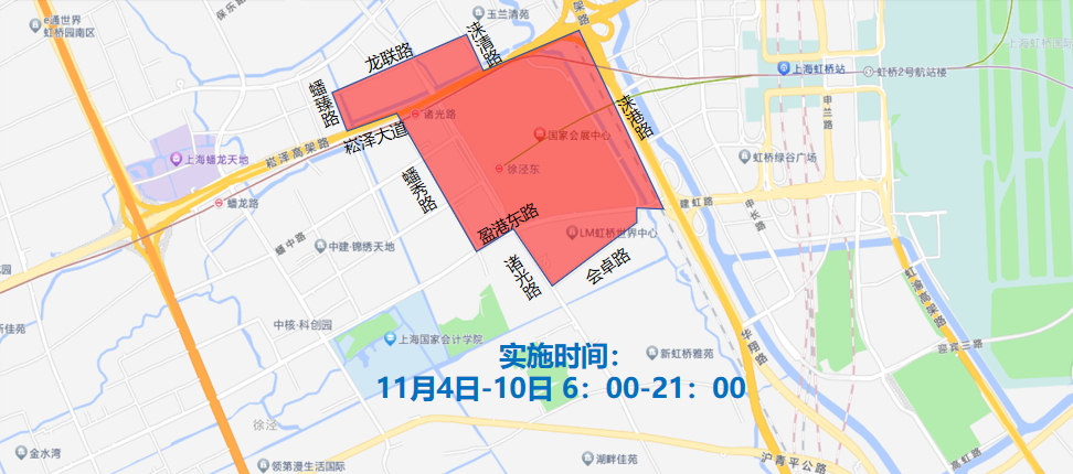 (三)11月4日至11月10日,每日6时至21时,在会卓路-诸光路-盈港东路-蟠秀路-崧泽大道-蟠臻路-龙联路-涞清路-崧泽大道-涞港路合围区域(除蟠秀路、蟠臻路、龙联路外,含上述道路)