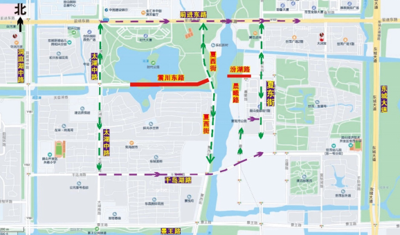 南北方向经过车辆,可由太湖中路、夏东街或洞庭湖中路、东城大道绕行。