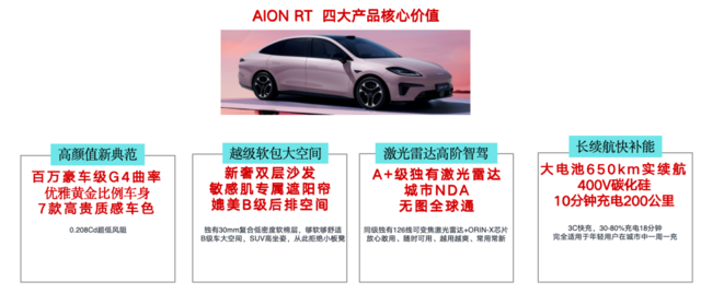 AION RT 作为埃安又一全球战略车型,定位新颜控智驾轿车,爱称为 “埃安迅猛龙”,它为全球年轻消费者带来了一款集颜值、空间、智驾、续航和补能等诸多优势于一身的 A + 级经典轿车。