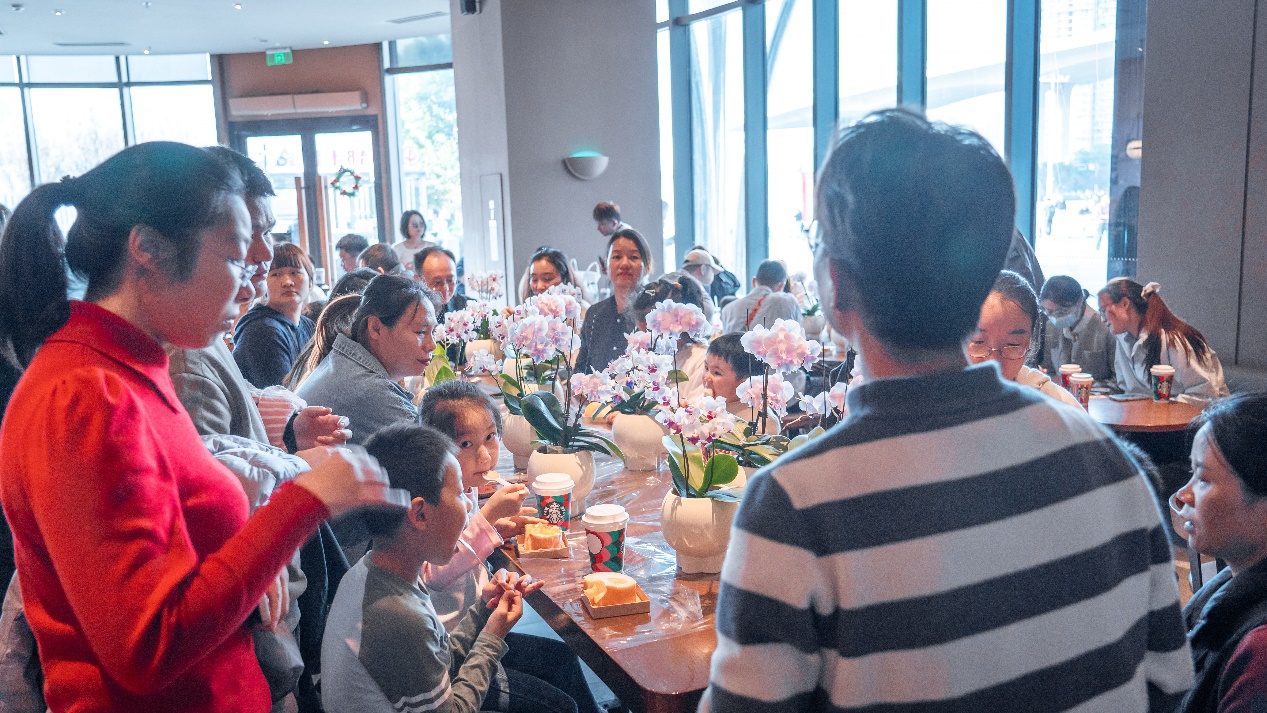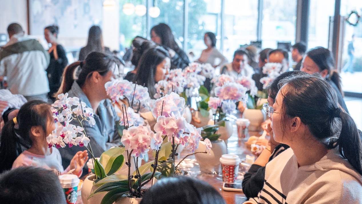 而在活动的另一边,星巴克&大蔡鲜花联合举办的精美茶歇&蝴蝶兰养护知识课堂也同样引人注目。为了感谢金钻卡会员们的长期支持与厚爱,昆山吾悦广场特别邀请了他们前来参加这一场别具一格的活动。在这里,消费者们不仅可以品尝到星巴克精心准备的咖啡和小点心,还能在大蔡鲜花的专业指导下,学习如何养护美丽的蝴蝶兰。