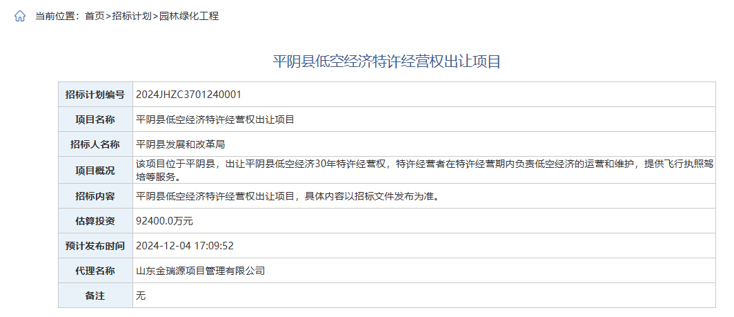 招标计划中对该项目的描述为:该项目位于平阴县,出让平阴县低空经济30年特许经营权,特许经营者在特许经营期内负责低空经济的运营和维护,提供飞行执照驾培等服务。