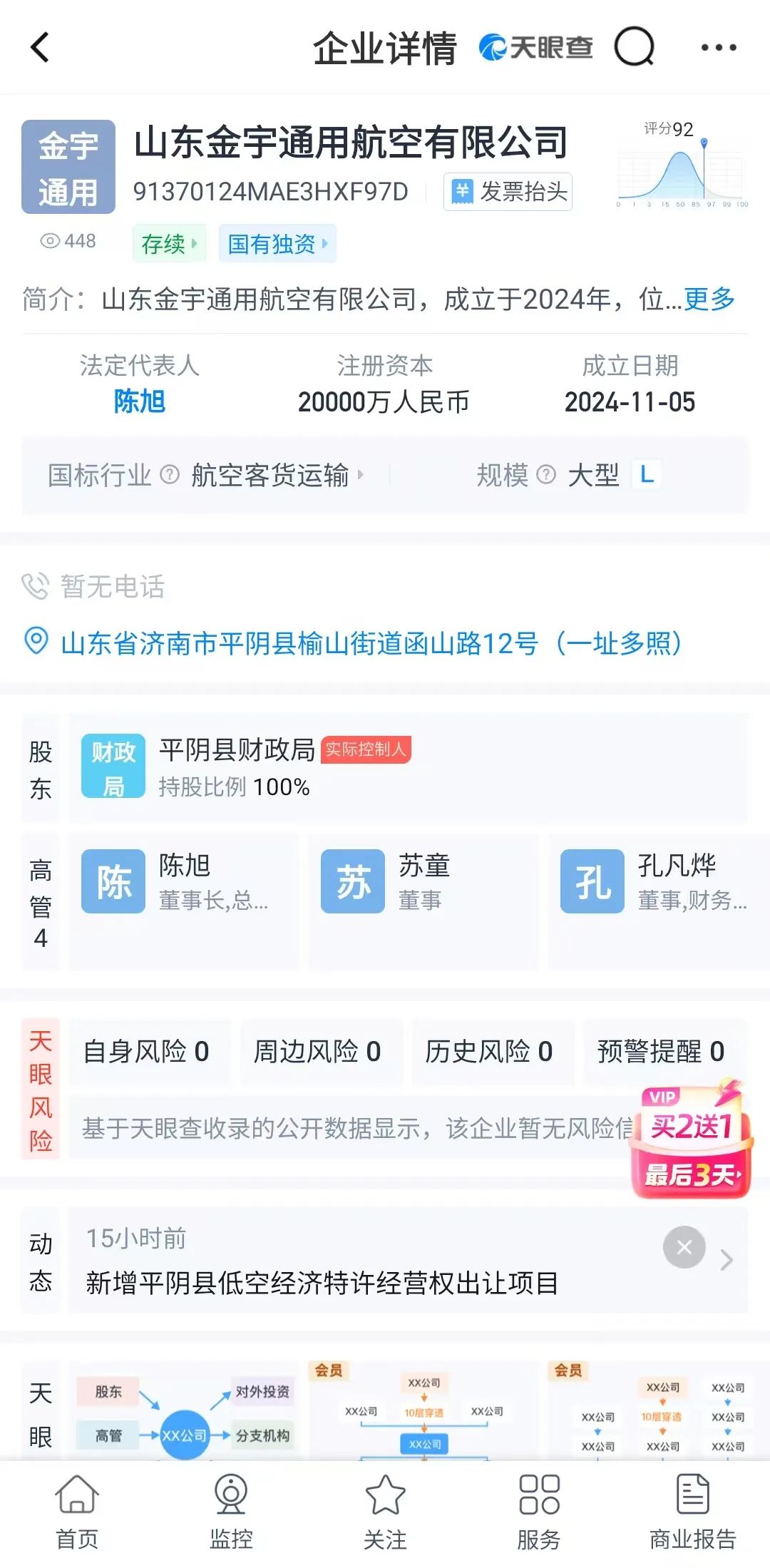 通过天眼查可以看到,中标企业山东金宇通用航空有限公司成立于今年11月初,注册资本2亿元,其实际控制人为平阴县财政局,为国有独资企业。