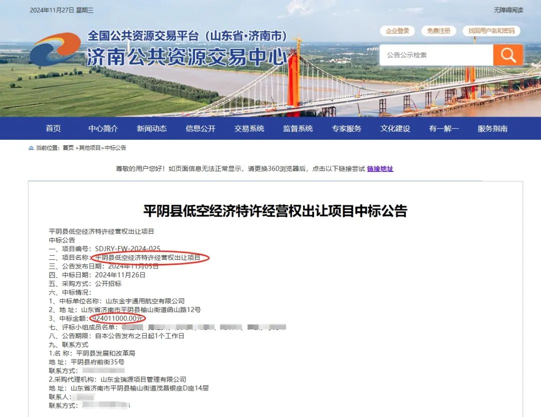 潇湘晨报记者从济南公共资源交易中心了解到,11月26日,该中心官方网站发布了《平阴县低空经济特许经营权出让项目中标公告》,据招标信息显示,中标单位为山东金宇通用航空有限公司,项目招标人为平阴县发展和改革局,项目为出让平阴县低空经济30年特许经营权。