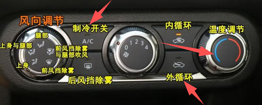 打开空调的制冷模式(按下A/C键),调低温度,把风向调到吹挡风玻璃上,开启外循环。