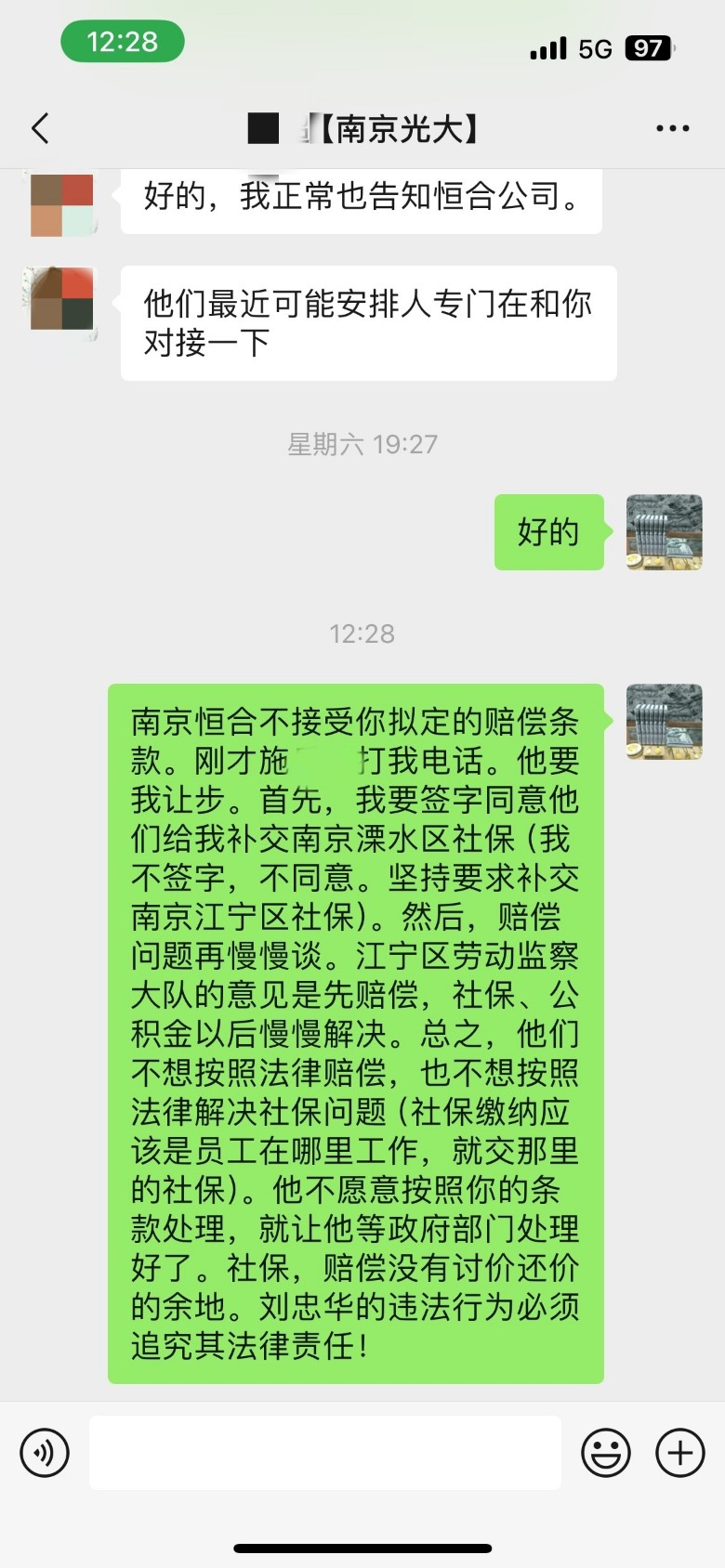 不接受私人转账,只接受南京恒合公司账户的工资,赔偿。