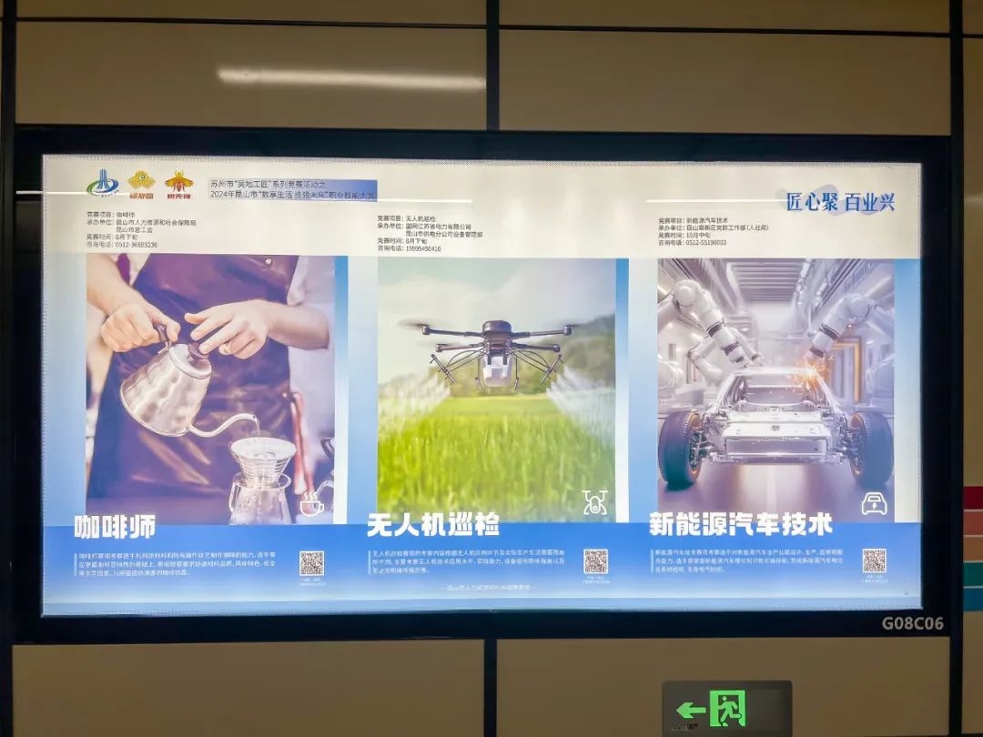 共青站以“人社宣传”为主题。通过充分利用地铁这一城市交通枢纽的宣传功能,全天候、全方位地展示人社服务的丰富内容和便捷途径。该站以生动有趣的宣传画面和各类实用的技能培训信息,为青年朋友提供了提升自我、优化充电的信息平台。