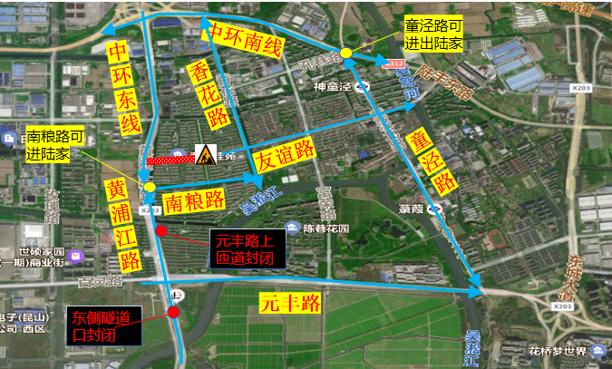 2、黄浦江路南向北往陆家方向的车辆请从元丰路转童泾路转中环南线转中环东线绕行;