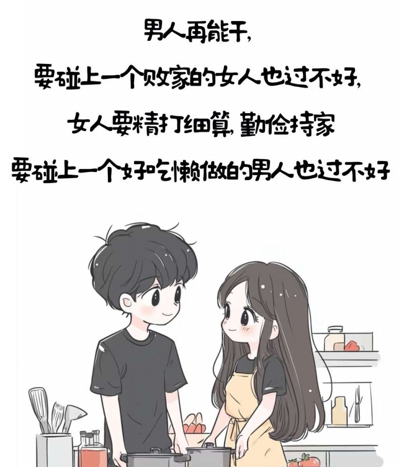• 2025-01-17 08:10 有个人路过: 纵观周围,一个家庭如果男人好吃懒做,女人就算再能干再忙碌,也好不到哪里去。一个家庭就算男人很能挣,女人好吃懒做,那也弄不像样的,家庭没什么温暖。所以我个人觉得一个能挣一个能守,家庭才不会差