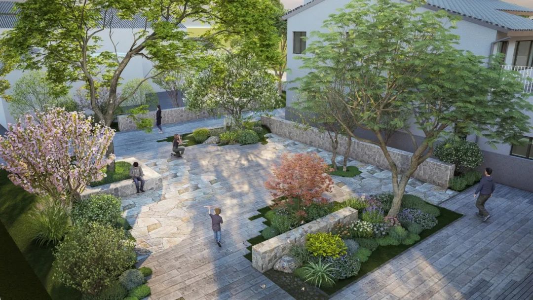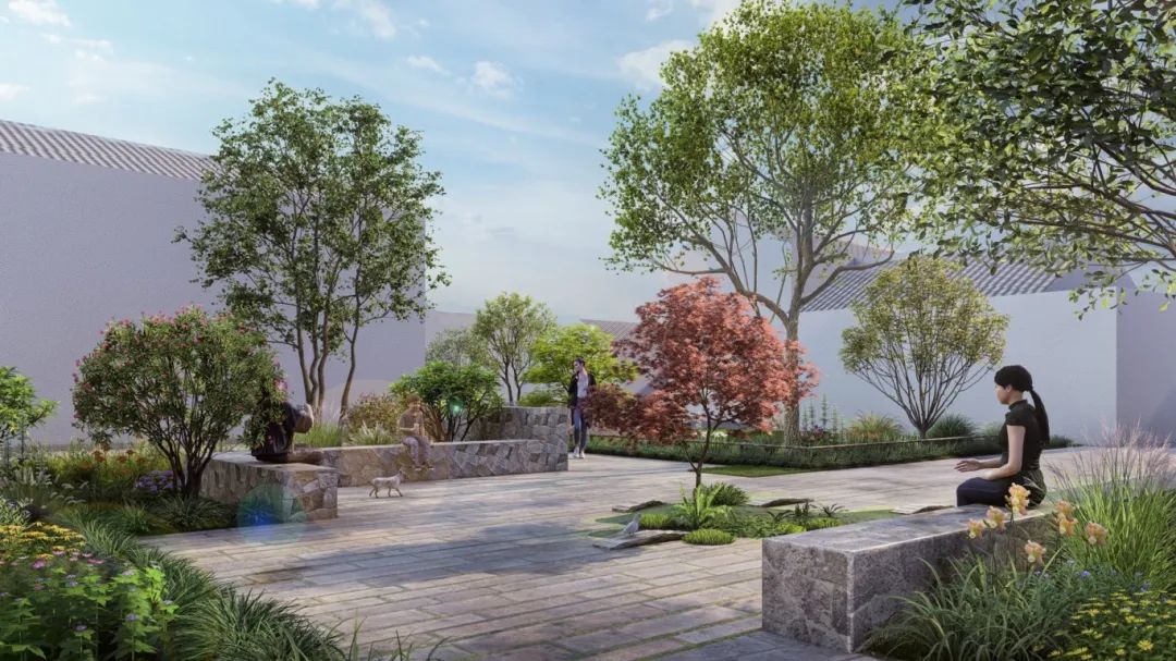 公共空间设计融入江南传统元素,塑造传统与现代结合的整体形象,利用低矮灌木丰富景观,形成错落有致的绿化配置,提升公共空间品质。